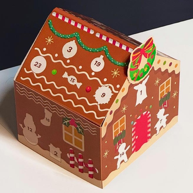 Skládací papírový adventní kalendář perníková chaloupka.