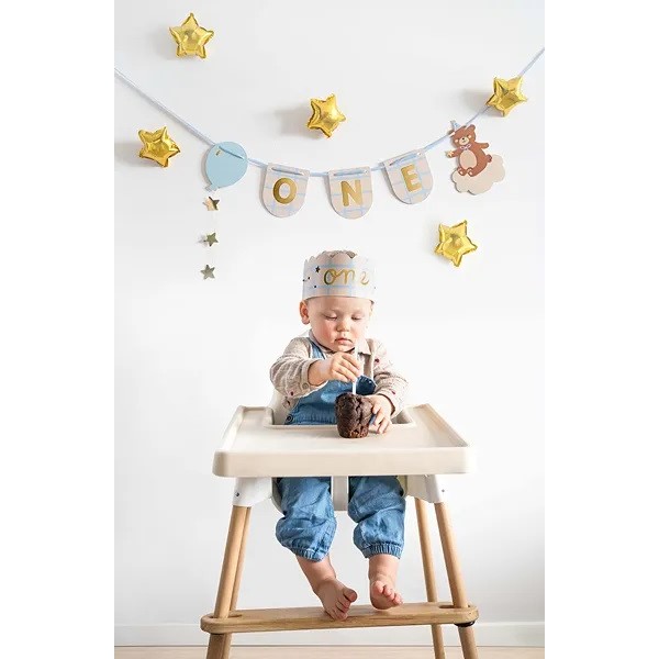 Skvěle se hodí k zavěšení např. na krmící židli. Banner je navíc ozdobený přívěsky: modrým balónkem se zlatými hvězdami a medvídkem. Banner i korunka se zavazují pomocí modré stuhy.