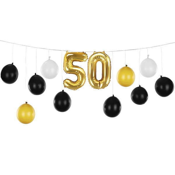 Girlanda obsahuje 10 latexových balónků ve 3 různých barvách: 6 ks černých, 2 ks bílých a 2 ks zlatých . Navíc sada obsahuje také 2 fóliové zlaté balónky ve tvaru číslic 5 a 0 , které dohromady tvoří číslo 50.