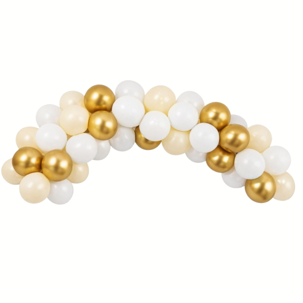 Elegantní balónková girlanda v kombinaci bílé a zlaté barvy, kterou snadno vytvoří i lidé bez dekoratérských znalostí. Skvěle se hodí pro svatby, narozeniny, slavnostní oslavy, silvestr i luxusní party.