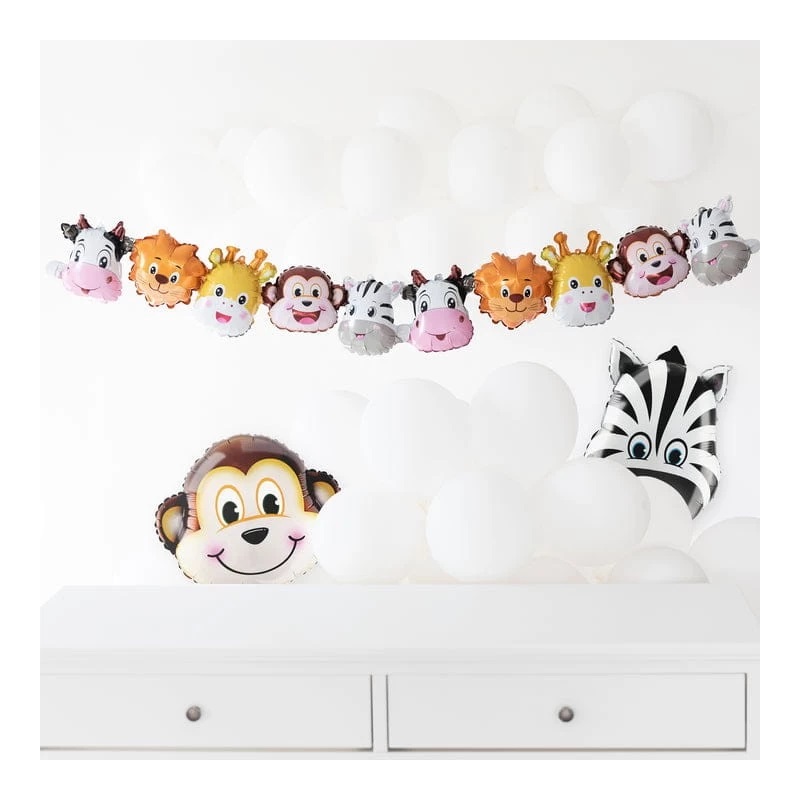 Balónková girlanda ve tvaru hlaviček zvířátek je krásnou dekorací do interiéru nebo výzdobu narozeninové párty se zvířátky ze zoo.
