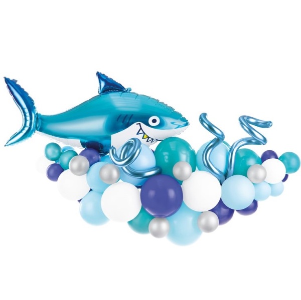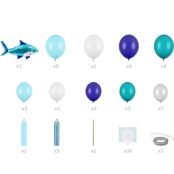 Sada obsahuje celkem 42 ks latexových balónků, 4 ks modelovacích balónků, 30 ks pěnové pásky, 1x fóliový balónek Žralok, 1x papírové brčko a 2,5 m balónkové girlandové pásky.