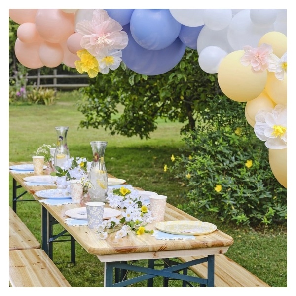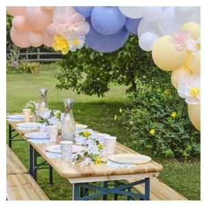 V této sadě naleznete 60 ks pastelových balónků (modrý, žlutý, růžový, bílý a světle růžový) v různých velikostech a 8 květin z hedvábného papíru (1 x o průměru 20 cm bílá, 2 x o průměru 12 cm bílá, 1 x o průměru 20 cm růžová, 2 x o průměru 12 cm růžová, 2 x o průměru 10 cm žlutá).