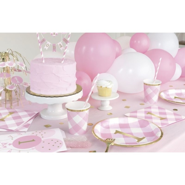 Roztomilá stolní dekorace s balonky různých velikostí s zlatými konfetami je vhodná na oslavu narození holčičky, narozenin děvčete, párty v barvě baby pink.