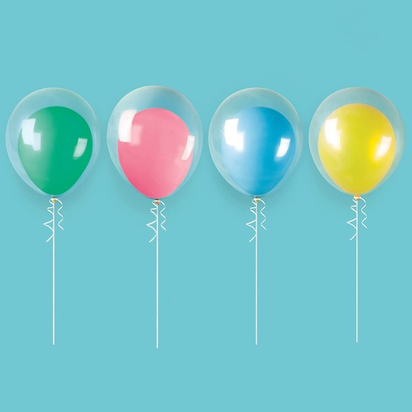 Sada transparentních balónků, ve kterých jsou uložené malé neonově zbarvené latexové balónky.