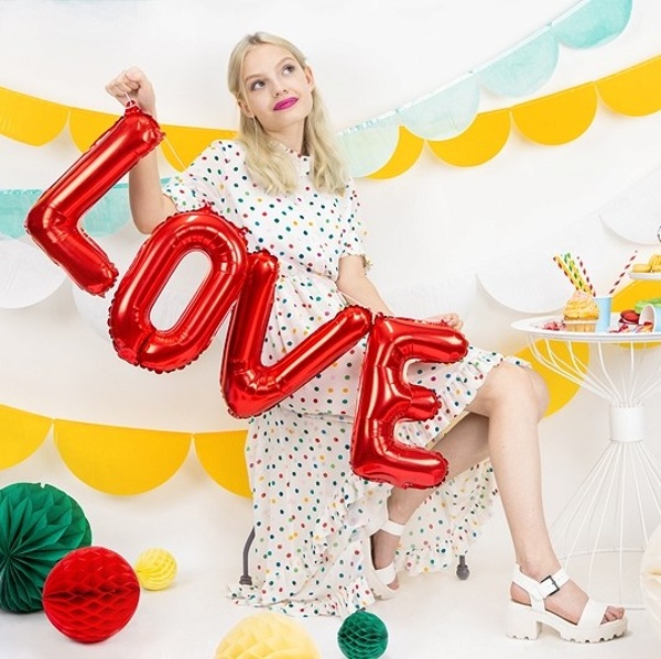 Balónkový nápis LÁSKA je vytvořen z červených fóliových balónků.