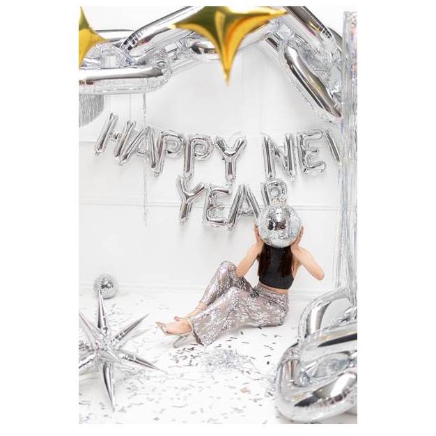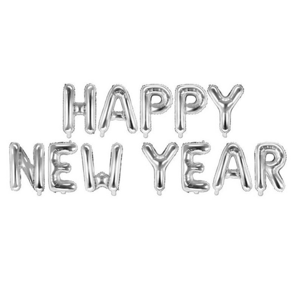 Stříbrný nápis s nápisem Happy new year je tvořený z fóliových balónků