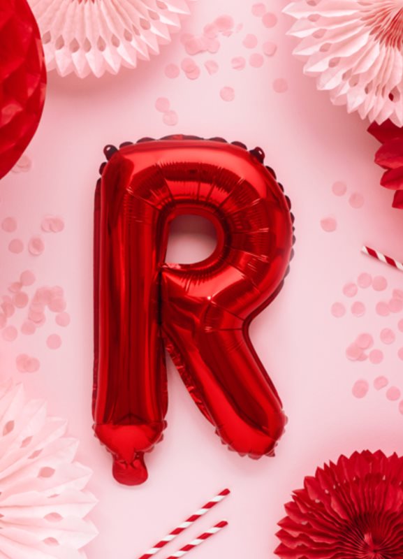 Metalický fóliový balónek Písmeno "R", červený, velikost před nafouknutím cca 40 cm, výška cca 35 cm. Nafoukněte vzduchem.