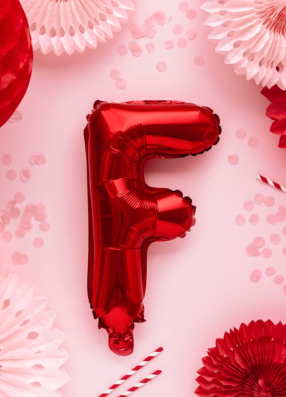 Metalický fóliový balónek Písmeno "F", červený, velikost před nafouknutím cca 40 cm, výška cca 35 cm. Nafoukněte vzduchem.