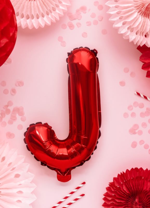 Balónek z metalické fólie Písmeno ''J'', červený, velikost před nafouknutím cca 40 cm, výška cca 35 cm. Nafoukněte vzduchem.
