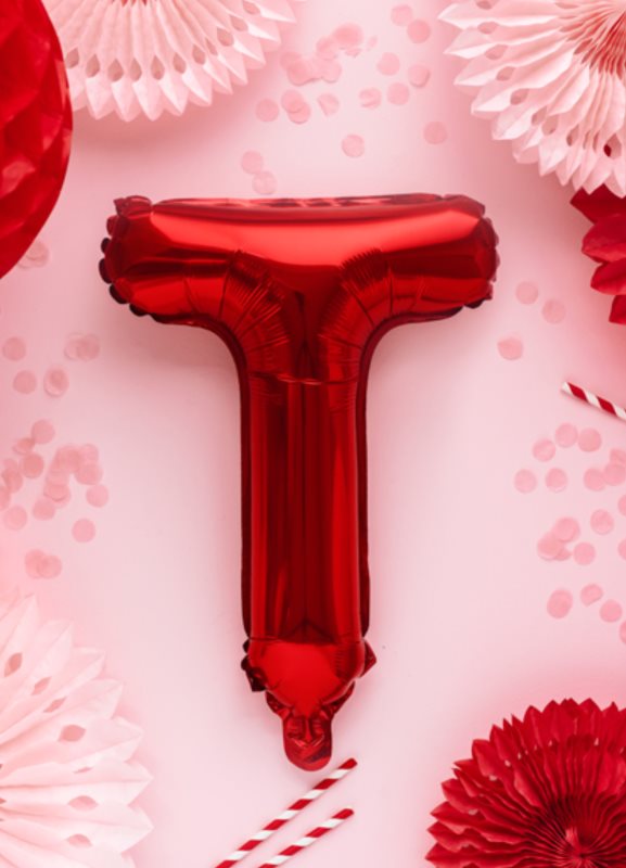 Balónek z metalické fólie Písmeno "T", červený, velikost před nafouknutím cca 40 cm, výška cca 35 cm. Nafoukněte vzduchem.