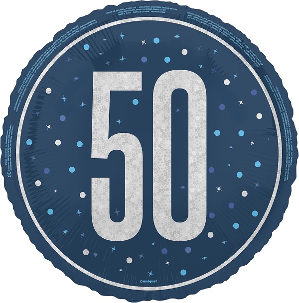 Třpytivý modrý balónek je vhodný nejen jako doplněk výzdoby jubilejních 50.narozenin, ale určitě potěší oslavence také jako dárek.