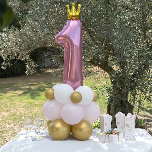 Samostojný balónkový set s růžovým číslem 1 a zlatou korunkou.