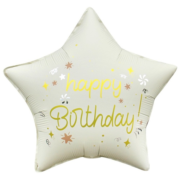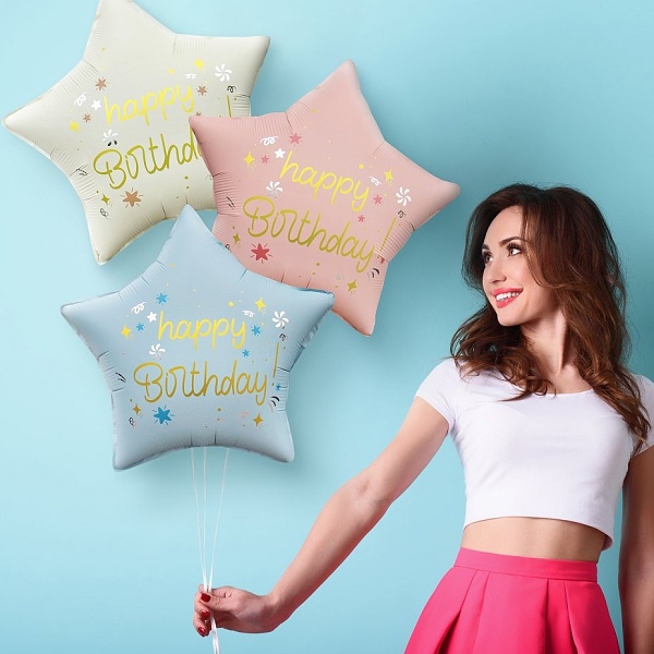| Balónek fóliový ve tvaru hvězdy s oboustranným potiskem Happy Birthday Velikost balónku je 44 cm a jeho barva je světle … |
