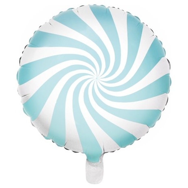 Balónek fóliový ve tvaru bonbonu je světle modré barvy s pruhy.