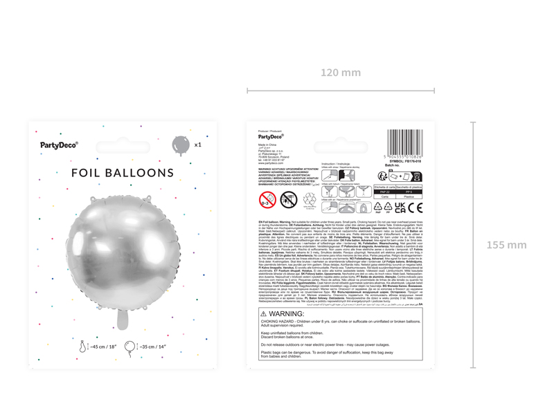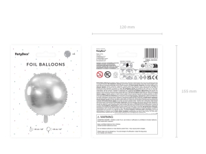 Zrcadlový kulatý balónek ve stříbrné barvě, velikost před nafouknutím cca 45 cm, velikost po nafouknutí cca 35 cm. Nafoukněte vzduchem a heliem. Sada obsahuje brčko.