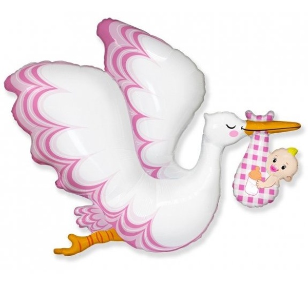 Fóliový balónek létajícího čápa, který drží miminko, je skvělým nápadem na výzdobu pro narození holčičky, dárek při příležitosti oslavy narození děvčátka nebo tématickou párty baby shower pro odhalení pohlaví dítěte.