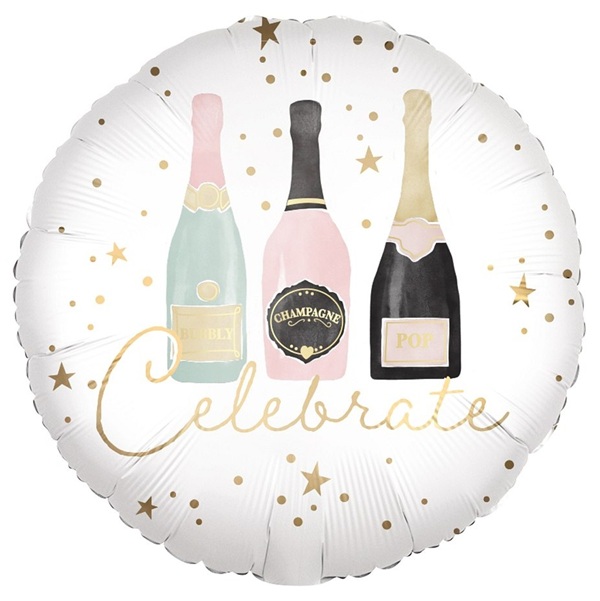 Kulatý fóliový balónek s potiskem tří lahví šampaňského a nápisem "Celebrate" ve zlaté barvě.