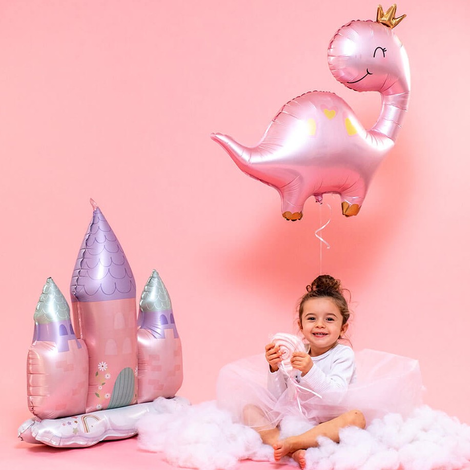 Růžový fóliový balónek ve tvaru dinosaura s korunkou a srdíčky na zádech.