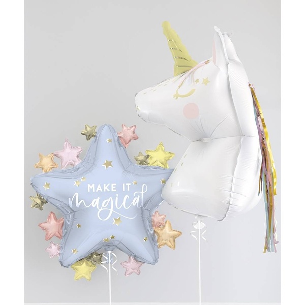 Foliový balónek ve tvaru hlavy jednorožce je velmi dekorativní. Balónek lze nafouknout klasicky vzduchem nebo héliem, pak je potřeba jej řádně uvázat.