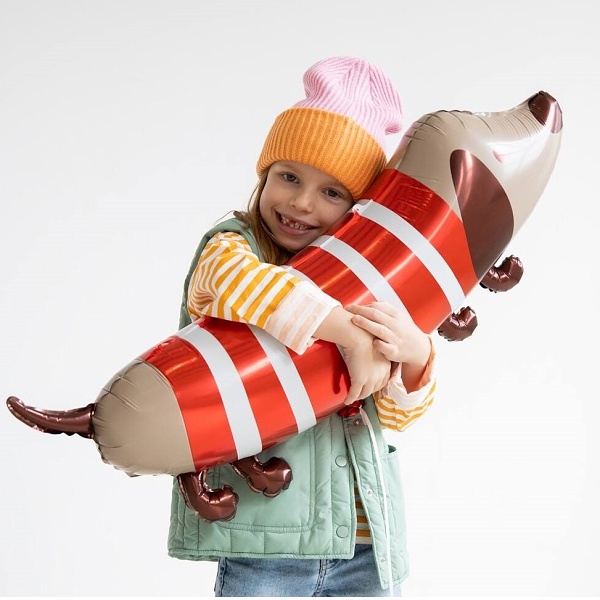 Fóliový balónek je ve tvaru legračního psa v pruhovaném svetru a je zábavná dekorace na párty nebo jako dárek, když chcete udělat k narozeninám dětem radost.