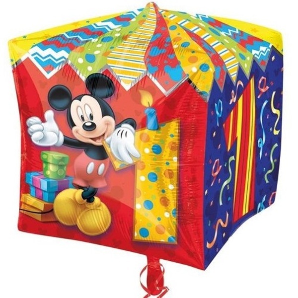 Fóliový barevný balónek ve tvaru krychle 1. narozeniny s oblíbeným Mickey Mousem je velmi originálním narozeninovým překvapením.