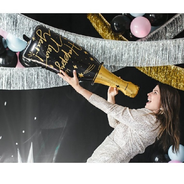 Proto by tato stylová černá láhev šampaňského z fólie se zlatým nápisem Happy New Year neměla chybět na vaší silvestrovské párty.