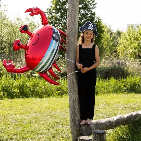 Fóliový balónek ve tvaru pirátského kraba upoutá svou intenzivní červenou barvou, zdobenou pruhy a emblém pirátské lebky.