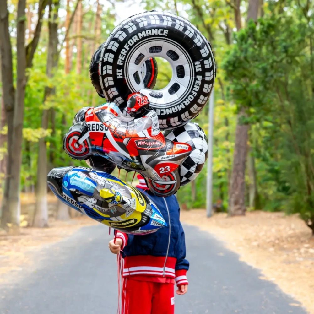 Balónek má realistický vzhled závodního kola s detailním potiskem dezénu, takže se skvěle hodí jako dekorace pro