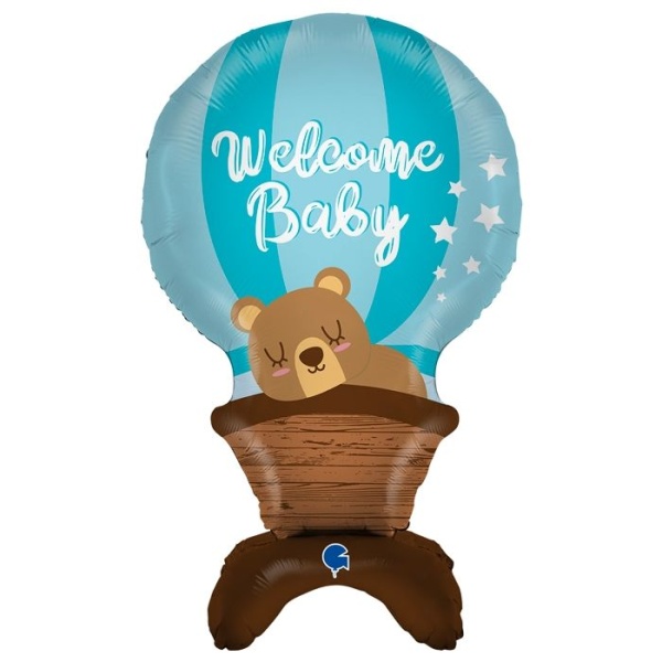 Samostojný fóliový balónek Welcome Baby ve tvaru horkovzdušného balónu, ve kterém pospává medvěd.