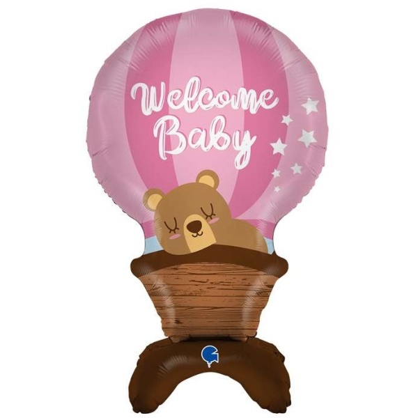 Samostojný fóliový balónek Welcome Baby ve tvaru horkovzdušného balónu, ve kterém pospává medvěd.