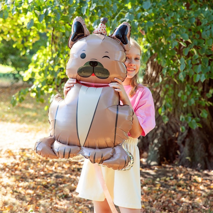Fóliový stojací balónek ve tvaru buldočka s narozeninovou čepicí.