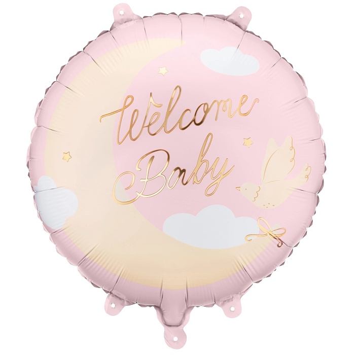 Fóliový balónek Welcome Baby ve světle růžové barvě s jemným béžovým měsíčkem a zlatým nápisem je ideálním středobodem výzdoby na baby shower pro holčičku i na přivítání miminka doma nebo v porodnici.