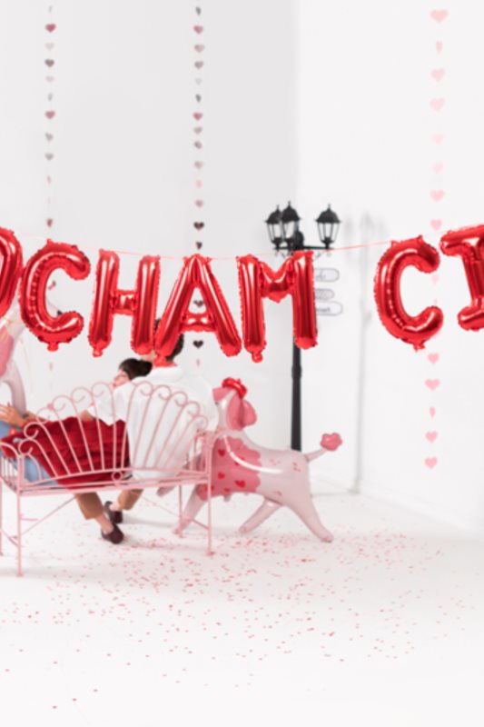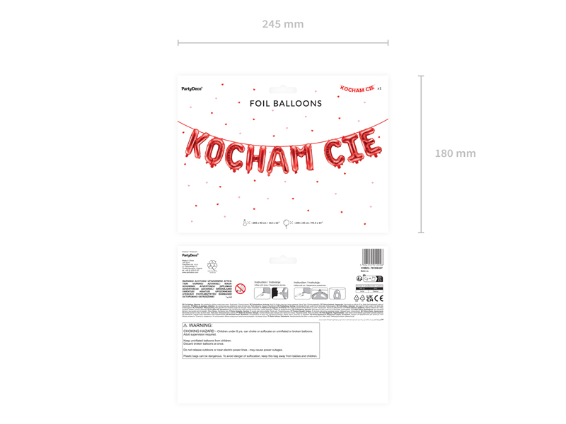 Metalický fóliový balón Kocham Cię v červené barvě, velikost před nafouknutím cca 285 x 40 cm (112 x 16''), velikost po nafouknutí cca 240 x 35 cm (94,5 x 14''). Nafukuje se vzduchem. Sada obsahuje brčko a stuhu o délce cca 3 m.