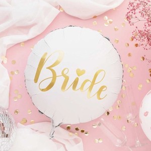 Fóliový bílý kulatý balónek se zlatým nápisem Nevěsta je skvělý doplněk pro dekoraci jak svatební, tak i rozlučky se svobodou nevěsty.