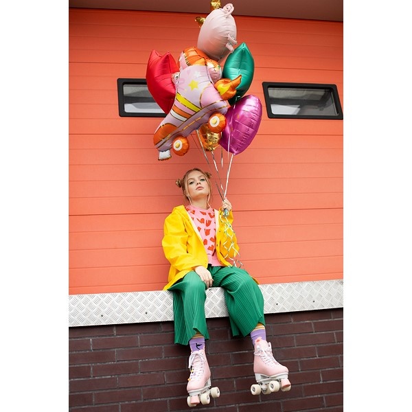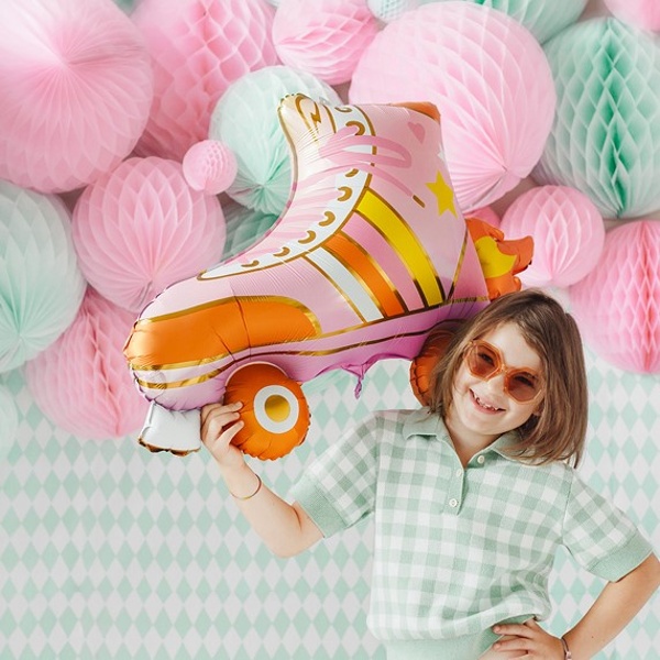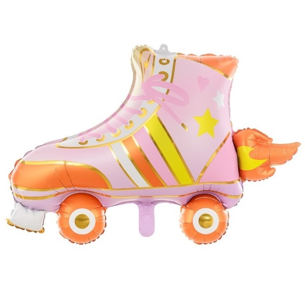 Balónek ve tvaru kolečkových bruslí je v pastelových barvách se zlatými ozdobami.