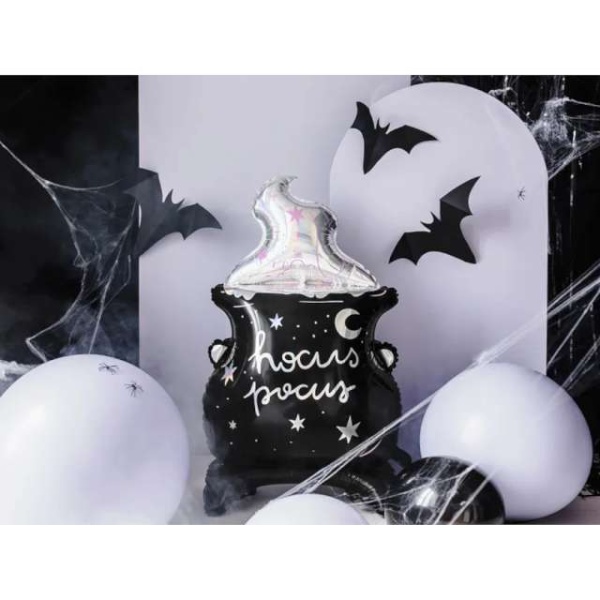 Fóliový balónek zobrazující stojící čarodějnický kotlík se stříbrným duhovým potiskem Hocus Pocus a stříbrným plamenem.