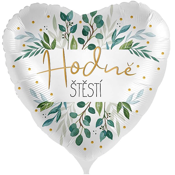 Balónek je vyroben z folie, ve tvaru srdce s krádným dekorem a nápisem Hodně štěstí