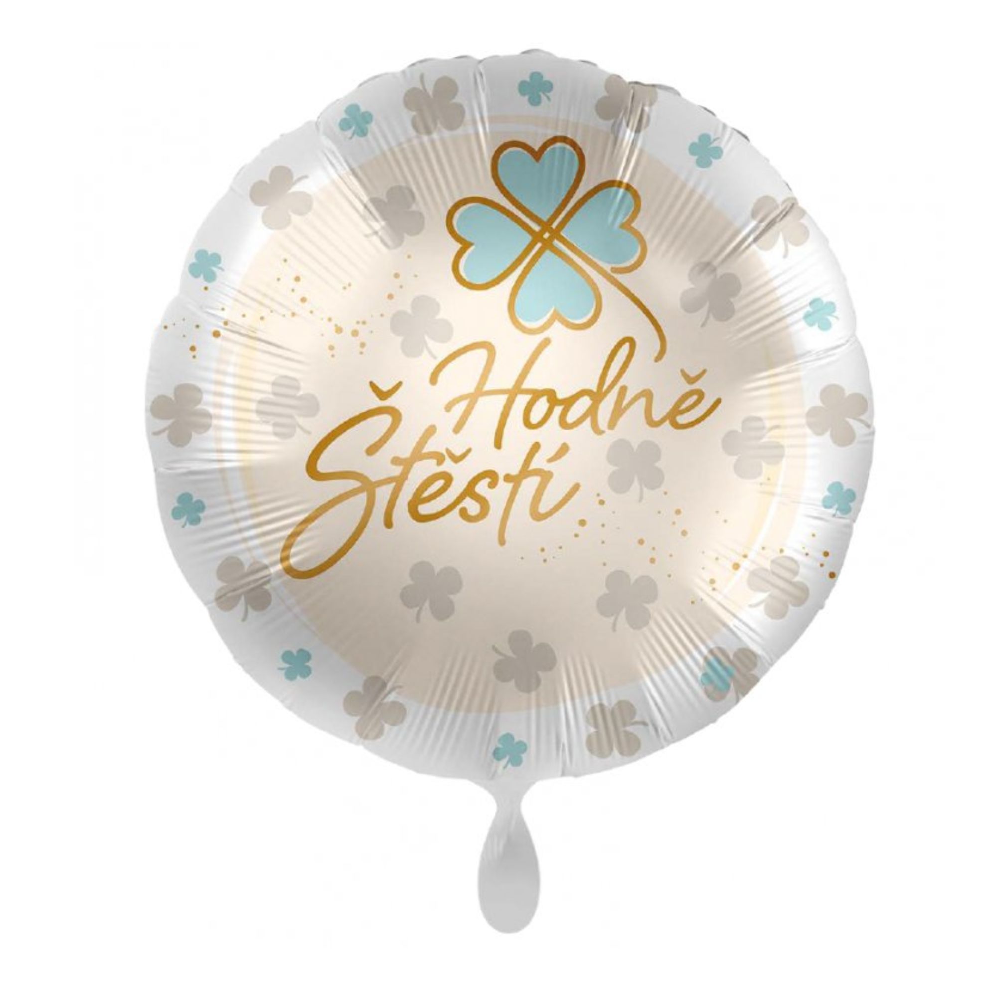 Balónek je vyroben z folie, kulatého tvaru s krásným dekorem a nápisem Hodně štěstí.