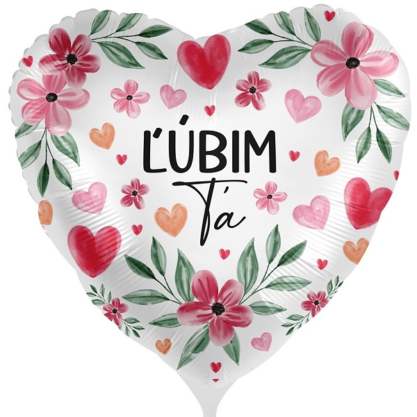 Balónek fóliový ve tvaru srdíčka, zdobený barevnými květy se slovenským nápisem Ľubim ťa.