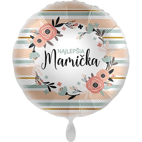 Fóliový nádherný balónek kulatého tvaru s květinami a proužky a slovenským nápisem Najlepšia mamička.