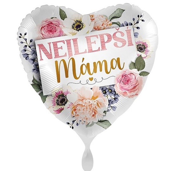 Fóliový nádherný balónek ve tvaru srdíčka s květy a s českým nápisem Nejlepší máma.