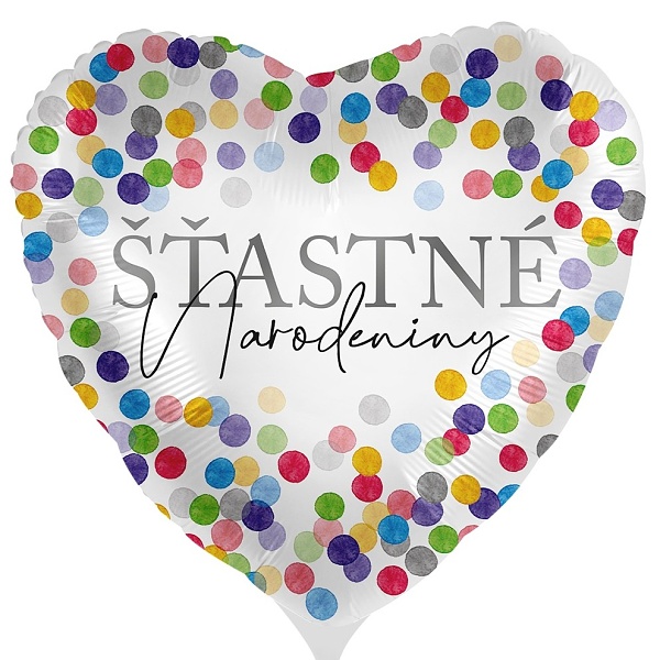| Balónek fóliový ve tvaru srdíčka s potiskem barevných puntíků a slovenským nápisem Šťastné narodeniny. Potěší jako … |