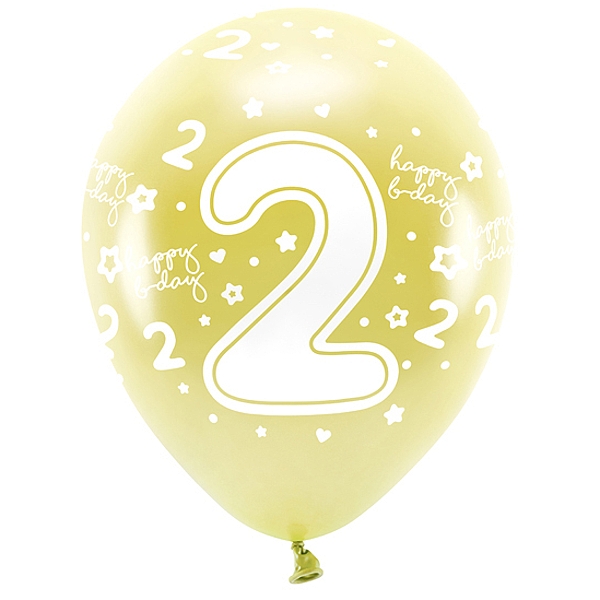 Metalické ekologické balónky číslo '' 2'' ve světle zlaté barvě s bílým, pětistranným potiskem, průměr cca 33 cm. (1 ks / 6 ks)