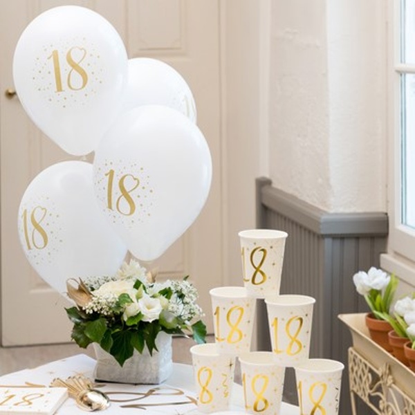 Bílý latexový balónek se zlatým číslem 18 a drobnými zlatými hvězdičkami.