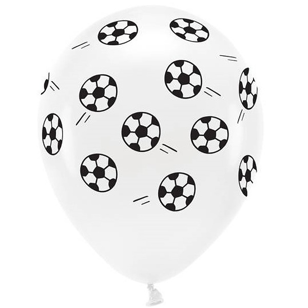Silné latexové balónky v pastelově čisté bílé barvě s černým, pětistranným potiskem fotbalových míčů