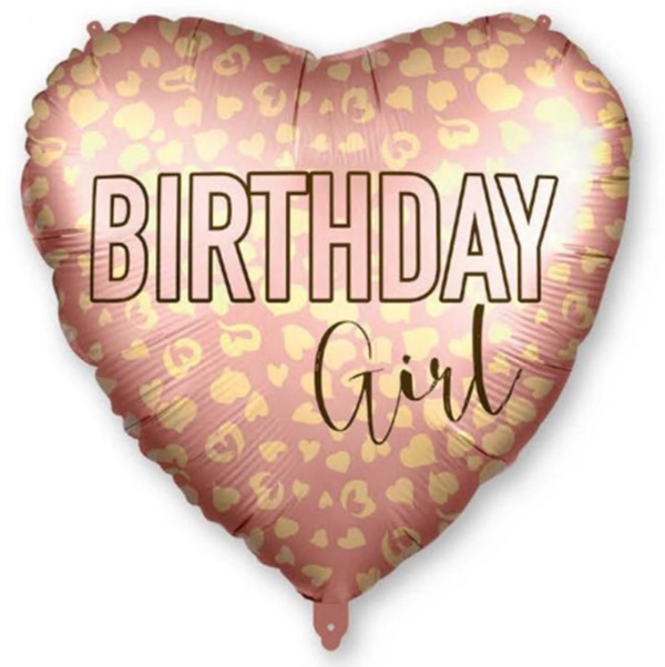 Fóliový narozeninový balónek ve tvaru srdce s nápisem Birthday Girl.