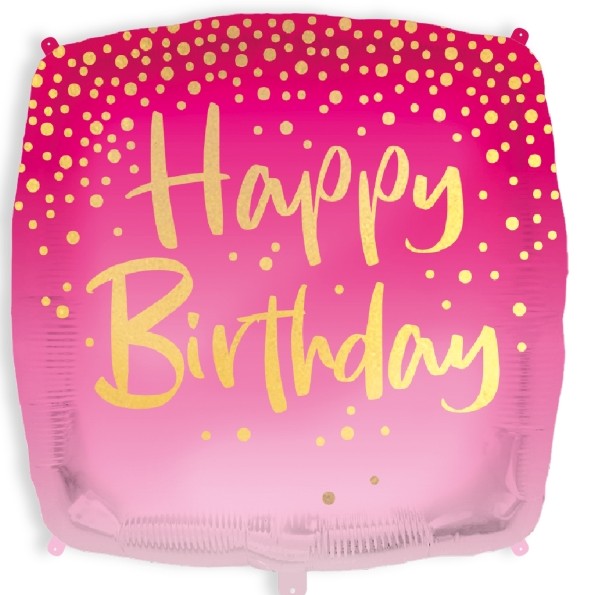 Fóliový balónek čtvercového tvaru se zlatým nápisem Happy Birthday na růžovém ombre pozadí