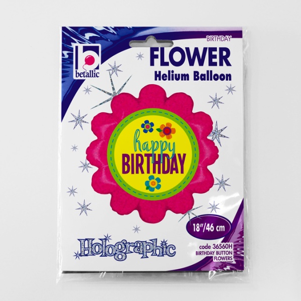 Fóliový holografický balónek ve tvaru kytičky s nápisem Happy Birthday.