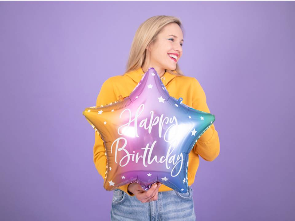 Originální narozeninový balónek - fóliová hvězda s nápisem Happy Birthday.